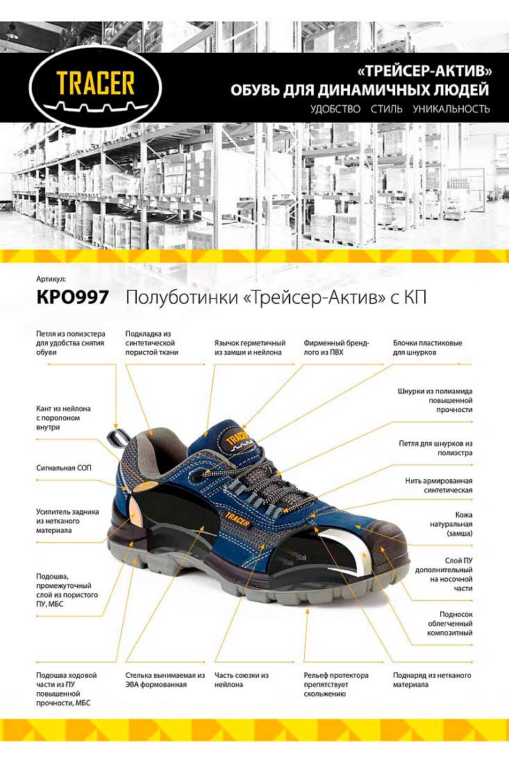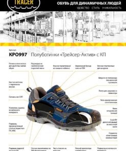 Особенности конструкции: обувная колодка эргономичной формы, к заднику полуботинка пришита петля из полиэстера для удобства снятия обуви. Прочные двухцветные круглые плетеные шнурки из полиамида. Дополнительный залив полиуретаном носочной части обуви защищает от механических повреждений. Полное отсутствие металлических деталей делает эту обувь более легкой и комфортной в эксплуатации.